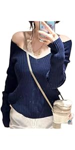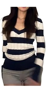 V Neck Sweater Women Vintage Ribbed Sweaters Pullover Knit Sweater Y2k Sweate…
